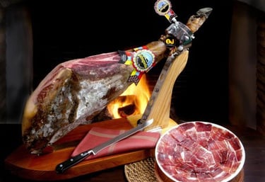 Desde el jamón serrano de Teruel, de sabor suave y equilibrado, hasta los majestuosos jamones ibéricos de bellota de Jabugo o Guijuelo, curados lentamente y con una textura sedosa que se funde en el paladar, cada pieza es una obra de arte.